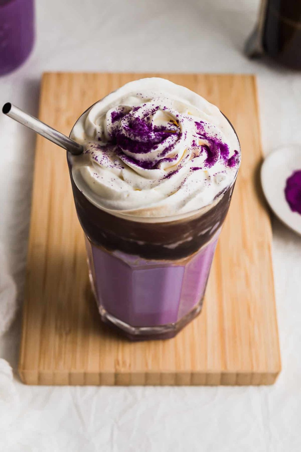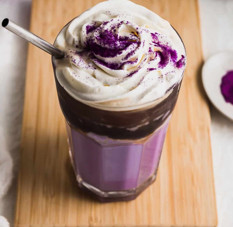 A pop of purple ube, smooth milk, double espresso and a dreamy cloud of whipped cream.